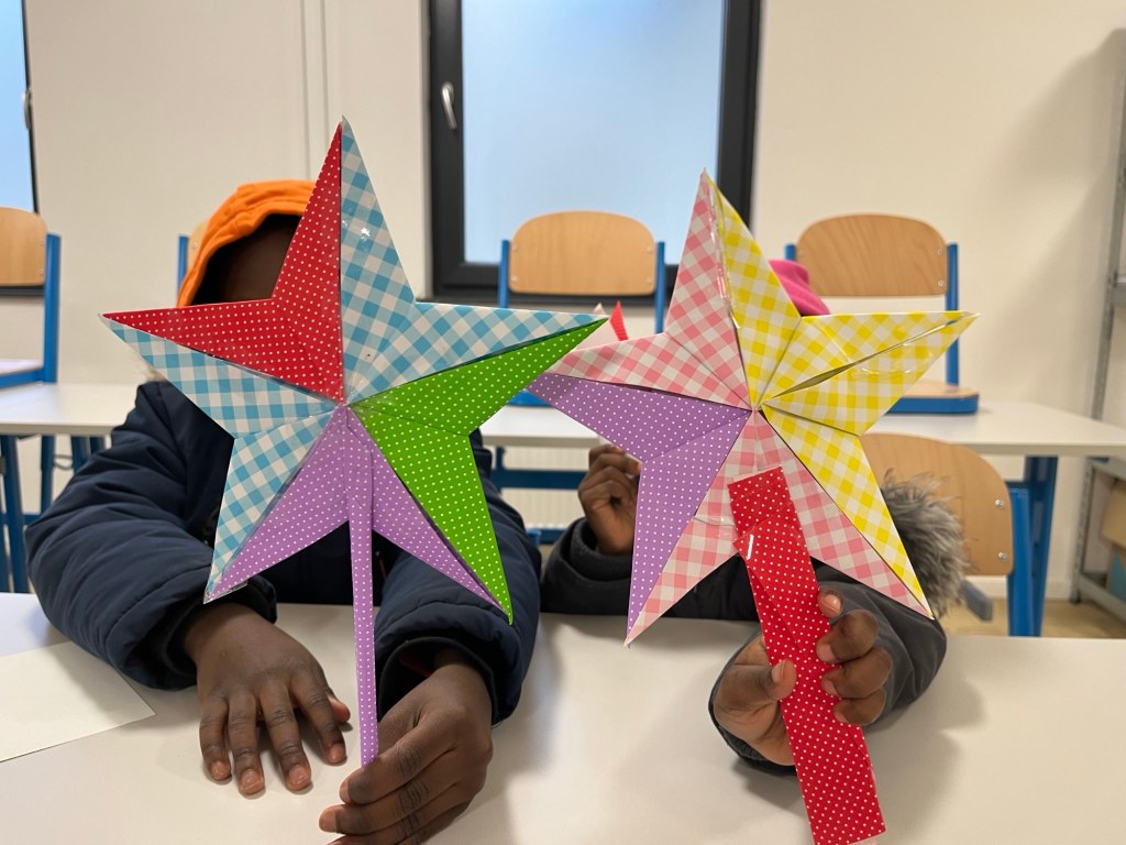 Surprisingly, origami requires a considerable vocabulary. Terms like ‘star,’ ‘fold,’ ‘carefully,’ ‘corner,’ and ‘crease with your fingernail’… each needed to be explained meticulously. Through this origami session, not only did we create beautiful stars, but it also served as a wonderful opportunity for the children to get to know me as a Japanese art teacher.