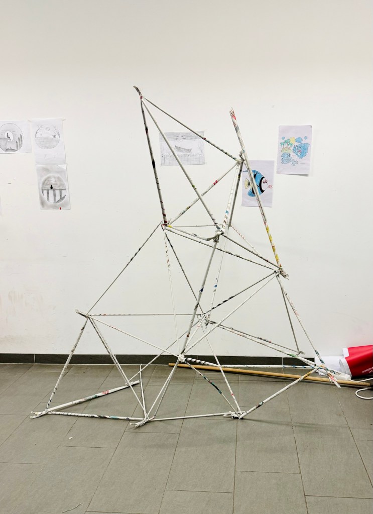 Mathematical thinking: Students recognize that the structure of squares is intuitively not particularly stable. First, everyone builds a tetrahedron from six rolled newspaper rods. This is boldly thrown towards the ceiling (usually eliciting cries of “We just made that!” from the students).